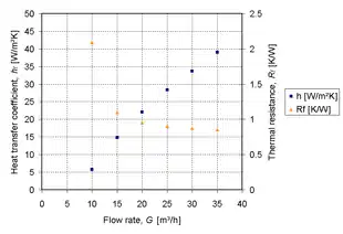 Using the equations 5 to 13 and the dimensional data in,[24] the thermal resistance for the fins was calculated for various air flow rates. The data for the thermal resistance and heat transfer coefficient are shown in the diagram, which shows that for an increasing air flow rate, the thermal resistance of the heat sink decreases.