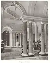 For the interior design, Lutyens continued the classical theme.[2] The vestibule floor was white marble.[11] The hall had green Siberian marble columns, a black marble staircase and a vivid green carpet. Blue was used for some other surfaces, and for the Lutyens-designed furniture.[12] He also designed star-shaped light fittings.[2] Other interior features designed by Lutyens which remain intact include the fireplaces, cabinets and cupboards.[4]
