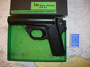 The HK P2A1 is a single-shot, break action flare pistol designed for signaling and illumination purposes.