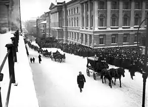 At about 4:30 PM on 14 February 1922, a strange-looking man had attracted attention at a barbershop in Kallio by exclaiming that minister Ritavuori would be shot at 5:00 PM, after which president Kaarlo Juho Ståhlberg and foreign minister Rudolf Holsti would meet the same fate.[3]