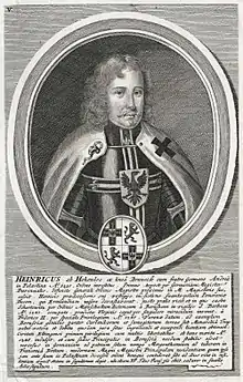 Heinrich von Hohenlohe (died 15 July 1249) was the seventh Grand Master of the Teutonic Order, serving between 1244 and 1249. He was the son of one of the richest and most powerful feudal lords in Württemberg and had four brothers and one sister.