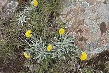 This perennial herb grows 8–60 cm (3.1–23.6 in) tall.[1] The rootstock is woody.[2] The leaves form a rosette at the base and sometimes also higher up the stem. The leaves growing at the base are the largest.[1] They are oblanceolate in shape and are silvery and silky.[2] Dense, many flowered flower heads are present between March and June. The flowers grow in cylindrical cymes located at the ends of branches.[2] The outer parts of the flowers are brown or straw coloured and the insides are tipped with bright yellow.[1]