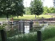 Fourteen of the locks had Marshall gates, which are unique to the Hennepin, and were raised and lowered on a horizontal axis. Five of the locks have been restored to working condition, although they are not used. One of these is a Marshall Gate lock. All of the gates from the remaining locks have been replaced with concrete walls, creating a series of waterfalls.