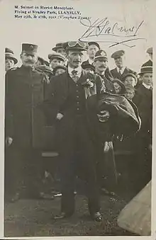 In 1913, Salmet flew in a tour of Great Britain, again sponsored by the Daily Mail, whose title was emblazoned beneath the wings of his Blériot XI-2. One of his passengers that year was the English illustrator Wyndham Payne.[7] In April 1914, he landed the Blériot at Gyllyngvase beach near Falmouth, where the wheels dug into the soft sand, and the aircraft tipped up onto its nose.[8][9] The Blériot was then fitted with its optional floats to enable operation from the sea. Soon after, an engine failure caused a forced landing on the sea near Lizard Point, during a flight carrying the Lady Mayoress of Falmouth.[8][9]