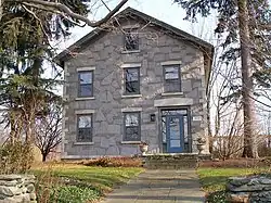 The Henry Bissell House stands in a rural-residential area of northwestern Litchfield, north of the borough of Bantam on the east side of Maple Street. It is a 2+1⁄2-story gable-roofed stone structure, with a rear wood-frame ell. It is built from locally quarried granite, with lighter stones chosen for corner quoining and window sills and lintels. Darker stones were used mainly as narrow horizontal elements, giving the house a distinctive appearance. The main entrance is in the rightmost bay, framed by sidelight and transom windows, and topped by a peaked lintel stone. The mortar in the walls appears to be original. The interior of the house follows a typical side-hall plan, and retains much original woodwork, which is typically Greek Revival or vernacular.[2]