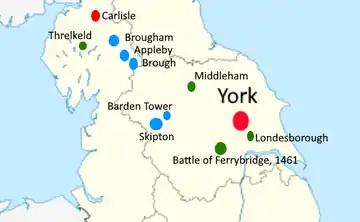 Clifford made a natural ally for King Henry, and soon became one of his most trusted men in the north.[50] Summerson suggests that Henry had little choice in restoring Clifford to his traditional regional position, as Northern England had been firmly Yorkist for over 20 years, first under the Nevilles and then under Gloucester. The latter had made Yorkshire his power base.[1] Clifford, already loyal to Lancaster and then Tudor, was an obvious choice to act as the King's man, and Henry gradually increased Clifford's power. On 2 May 1486[54] Clifford received the stewardship of the Lordship of Middleham and bailiwick of the Honour of Richmond.[1] The former had been one of Richard of Gloucester's most important headquarters.[55] After Richard took the throne, he granted it to Sir John Conyers,[54] one of Gloucester's closest advisers;[56] both Middleham and Richmond had been Neville strongholds before that.[57] Conyers seems to have been placed in Clifford's custody around this time, although relations between the two men seem to have improved: Clifford later jointly shared in a £1,000 bond to the King for Conyers's good behaviour.[58] In October 1486 Clifford sat on a commission to "levy for the King, all profits arising from the King's manors and lands in the counties of Westmorland and Cumberland, the lordship of Penrith and the forest of Inglewood" in expectation of an invasion by Scotland.[59]
