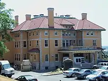 The 31⁄2-story house is composed of cream-colored brick in a combination of the Spanish revival and Mission revival styles. It sits high on the bluff on spacious, terraced grounds. The house remains largely intact even though the east side has been modified somewhat to connect to the main nursing home building.[13] There is a Porte-cochère on the north side of the house, and tall end chimneys with decorative concrete caps at several different locations. Other decorative elements on the houses exterior include Baroque ornamentation surrounding oval windows; a balustraded piazza; and superimposed loggia with columns distyle-in-antis. The entire structure is capped with multiple hipped roofs covered in red ceramic tiles.