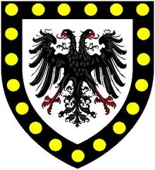 Arms of Killigrew: Argent, an eagle displayed with two heads sable a bordure of the second bezantée. The bezantée bordure indicates a connection to the ancient Earls of Cornwall