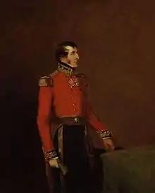 Between 1805 and 1807 he served as aide-de-camp for his uncle Lord Cathcart in Ireland and Egypt then as a major in the 26th Cameronians during the Walcheren Campaign (1809) and its siege of Flushing.[3] Having joined the 26th on 26 March 1807 he remained with them for three years. On 2 August 1810 he joined the 18th Hussars as a major. He remained with the 18th Dragoons until the end of the Napoleonic Wars, being promoted to Lieutenant-Colonel of the Regiment on 2 January 1812.[2] During a crossing of the Esla River while with the 18th Hussars, his horse fell severely injuring him after which he spent some time in the hospital at Palencia.[4] He was present at the Battle of Morales (2 June 1813), despite still suffering from the severe wound to his knee.[1]