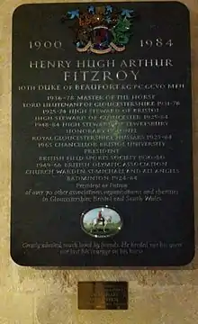 Henry Hugh Arthur FitzRoy Somerset, 10th Duke of Beaufort KG, GCVO, PC (4 April 1900 – 5 February 1984), styled Marquess of Worcester until 1924, was a peer, landowner, society figure and a great authority in the fields of horse racing and fox-hunting. As a relative and very close friend of the Royal family, he held the office of Master of the Horse for 42 years (1936–1978), the longest to hold the position. He founded the Badminton Horse Trials and was deemed "the greatest fox-hunter of the twentieth century";[1] his long tenure as Master of the Beaufort Hunt led to his being universally nicknamed Master and his car bore the private numberplate MFH1. In 1980 he published the authoritative book Fox-Hunting.