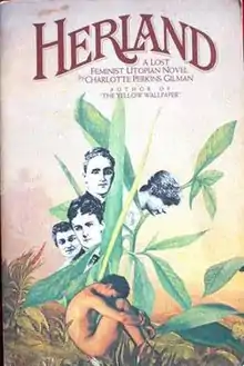 Herland is a utopian novel from 1915, written by American feminist Charlotte Perkins Gilman. The book describes an isolated society composed entirely of women, who bear children without men (parthenogenesis, a form of asexual reproduction). The result is an ideal social order: free of war, conflict, and domination. It was first published in monthly installments as a serial in 1915 in The Forerunner, a magazine edited and written by Gilman between 1909 and 1916, with its sequel, With Her in Ourland beginning immediately thereafter in the January 1916 issue. The book is often considered to be the middle volume in her utopian trilogy, preceded by Moving the Mountain (1911). It was not published in book form until 1979.