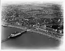 It was built all of timber, with the piles being driven straight into the sea bed; it was "considered at the time the best specimen of pile-driving", and described as a "pier and breakwater".[2] There was curved stone balustrading at the entrance, taken from old London Bridge which was demolished in 1831. A sail trolley vehicle running on tracks, powered by sail and foot and nicknamed Neptune's Car, ran the length of the pier from 13 June 1833, carrying passengers and baggage. When wind was inadequate as commonly happened, pier employees physically pushed the trolley.[7] The pier's length was defined by the one-fathom draught of the paddle steamers and the shallow two-fathom depth of the sea even three quarters of a mile offshore at high tide. It was followed in 1861 by the railway station, and thus began the town's growth into a holiday resort.[8] However, because the wooden piles were never protected by copper sheathing they suffered from shipworm. By 1850, many piles had been replaced with iron ones, or with wooden ones "prepared by Mr Payne's process" against shipworm,[2] but as a whole they showed irreversible deterioration from 1860 onwards. Pier dues were considered expensive at 1s 6d.[2] Subsequently, the first Herne Bay Pier Company failed due to competition between paddle steamers and the new railway which was opened on 13 July 1861, because previously most visitors arrived by steamer, then they all arrived by rail. The first pier was taken down in 1870 to 1871,[3] long after the paddle steamers stopped coming in 1862.[4][5][6]