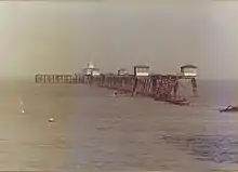 Sea-anglers and others petitioned for the pier to be repaired, but storms on 11 January 1978 and in February 1979 caused progressive collapse of the central portion of the pier between the two Bailey bridges, and its remains were dismantled in 1980. The pier head was too solid for demolition, so it remains isolated at sea with its solar-powered navigation light on a pole.[3][4] From 1989 the Waverley Preservation Society and Medway Queen Preservation Society have shown interest in a future rebuilding of the deep sea pier.[5] The Association of Hotels, Business and Leisure (HBL) has been promoting the rebuilding of a deep-sea pier, and has created and costed its own design.[15] A redevelopment plan for the pier was suggested by Cooperman Vision in 2004 and a feasibility study was carried out by the Council, but it came to nothing.[16] In 2008 MP Roger Gale suggested that if Canterbury City Council had not refused permission for a casino in Herne Bay, that casino may have helped fund reconstruction of the pier.[17] At the same time, Canterbury City Council was setting up the Herne Bay Pier Trust as a charitable trust to raise £12.5 million to rebuild the pier.[18] As of February 2010, the sports centre was due to be closed in 2011, and on 22 February 2010 the £10,000 Herne Bay Pier Report was published by Canterbury City Council in association with Humberts Leisure, with the suggestion that the Herne Bay Museum and King's Hall sites be sold for redevelopment, to pay for a new build on top of the remaining pier stub. The time limit for public objections was 19 April 2010.[6][10][11][19] The National Piers Society suggested in 2009 that the remaining stub of the pier was at serious risk of demolition or collapse.[20] The sports pavilion was demolished in 2012.[21] In 2015 drone footage revealed the crumbling condition of the isolated pier head.[22] In September 2019 there are fears that the pier head is precariously propped up by a piece of plywood and is at risk of collapse.[23]