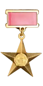 The title Hero of the Democratic Republic of Afghanistan (Pashto: افغانستان دیموکراتیک جمهوریت اتل) was the highest distinction in the Democratic Republic of Afghanistan, awarded to both citizens of the Afghanistan and other states who have performed heroic deeds in the name of defending the gains of the Saur Revolution, freedom, territorial integrity and independence of the Democratic Republic of Afghanistan or who have made an outstanding contribution to strengthening the defense of the Afghan state. It was awarded alongside the Order of the Saur Revolution and the Order of the Sun of Liberty.[1][2][3]