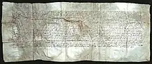 The oldest recorded mention of the village Hertník is from 1351 and can be found in the statement issued by Spišská Kapitula (one of the medieval Hungary's "places of authentication"[4]) which confirms that Hertník belonged to the Lords of Perín (Perényi, a noble Hungarian family).[5] Mikuláš from Perín reconfirmed this claim later in a statement issued in 1355 where he declared that Hertník, Šiba, Richvald and Kľušov were in the possession of the Perín family since 1325. Hertník belonged to the Perins until around 1440 when a free royal town of Bardejov became a new owner. In 1442 a Richnava's Bratrík captain Ján Talafúz seized Hertník and other villages from Bardejov. However, in 1446 Hertník was repossessed by Bardejov (the church of Saint Aegidius).