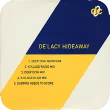 "Hideaway" is a song by American house music group De'Lacy, featuring vocals by Rainie Lassiter. It is the group's most successful single and is written by Kevin Hedge and Josh Milan, and produced by Blaze. The Deep Dish remix peaked at number-one in Italy.[2] It also reached number nine in the UK[3] and number 38 on the Billboard Hot Dance Club Play chart in the US. The song has been remixed and re-released several times. A remixed version, called "Hideaway 1998", which featured a mix by Nu‑Birth,[4] peaked at number 21 in 1998. The song was released a third time in 2006 and reached number 82 in the Netherlands.