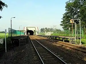 Higashi-Oiwake Station was served by the Sekisho Line, and was situated 21.6 km from the starting point of the line at Minami-Chitose Station.[1] The station was numbered "K16".