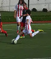 Hilal Çetinkaya driving the ball for Ataşehir Belediyespor in the home match against Karşıyaka BESEM Spor in the 2014–15 season.