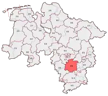 Hildesheim is located in southern Lower Saxony. As of the 2021 federal election, it comprises the district of Hildesheim.[1]