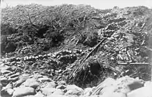 By October 1916, the mine under Hill 60 held 53,300 pounds (24,200 kg) of explosives and that under The Caterpillar 70,000 pounds (32,000 kg), despite water-logging and the demolition by a camouflet of 200 feet (61 m) of a German gallery above the British diggings, which endangered the British deep galleries.[29][30] The 1st Australian Tunnelling Company took over in November 1916 and maintained the mines beneath Hill 60 and The Caterpillar over the winter and months of underground fighting until June 1917, when they were fired along with the rest of the mines under Messines Ridge at the beginning of the Battle of Messines (7–14 June 1917).[29][30] When the mines were detonated at 3:10 a.m. on 7 June 1917, 990,000 pounds (450,000 kg) of explosives went off under the German positions, demolishing a large part of Hill 60 and killing c.10,000 German soldiers between Ypres and Ploegsteert.[31][lower-alpha 4]