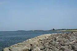 View of Hills Beach, Basket Island, Stage Island, and Wood Island from the mouth of the Saco River