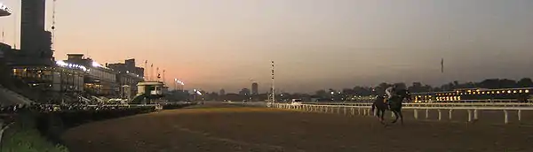 The course itself consists of three courses, made of eighty percent sand, fourteen percent limestone, and six percent clay, with a special natural drainage system that allows for normal racing to continue on rainy days. The main course is 2,400 metres (1.5 mi) around, 28 metres (31 yd) wide, 600 metres (0.37 mi) from the final turn to the finish line, and a chute allowing for races as long as 1,100 metres (0.68 mi) to be run on a straight line. Up to 21 horses can run in a race at a time.[1] A turf course was added in 2011.[5]