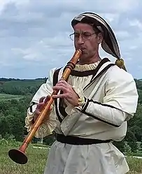 The Hirtenschalmei (or shepherd's shawm) is a double reeded woodwind instrument, with a cylindrical bore and a flared bell,[1] reconstructed based on iconographic sources in the late 20th century.[2] The instrument is described as producing a "buzzy" sound.[3] The Hirtenschalmei tends to be quieter than a shawm. The double reed in the instrument is capped. The instrument is often mentioned in medieval french literature and art, depicted as being played by rustic figures.