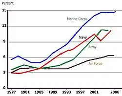 Latino representation in the navy has been rising and there has been dramatic increases in the percentage of Latinos (of both sexes) among active duty enlisted personnel.[67] In 1975, Lieutenant Al Cisneros, became the first Hispanic pilot to serve with the Blue Angels.[68] In 1981, four women of Hispanic descent became the first women of their heritage from the U.S. Naval Academy. Among the four women was Commander Lilia L. Ramirez (Ret.) who is currently the Director of the International Programs Office, for the Department of Homeland Security, Science and Technology Directorate.[69] By September 2006, Hispanics constituted 14 percent of navy enlisted personnel, about the same as in the Marine Corps that year. The various recruitment efforts do have critics, both within and outside the Hispanic community, particularly during this time of war and a growing number of reported Hispanic casualties.[70]