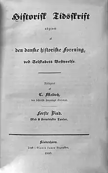 ![]() Title page of the first issue of "Historisk Tidsskrift", 1840 | |