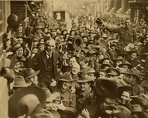 In 1919, Prime Minister Billy Hughes and former Prime Minister Joseph Cook travelled to Paris to attend the Versailles peace conference.[32] Hughes's signing of the Treaty of Versailles on behalf of Australia was the first time Australia had signed an international treaty. Hughes demanded heavy reparations from Germany and frequently clashed with US President Woodrow Wilson. At one point Hughes declared: "I speak for 60,000 [Australian] dead".[33] He went on to ask of Wilson; "How many do you speak for?"