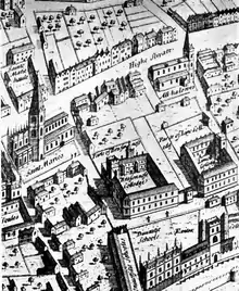 The chancellorship of Archbishop William Laud, beginning in 1630, was a calm and profitable time for the university as a whole, dominating as it did the city of Oxford.[31] The Parliamentarian occupation during the Civil War in 1642, and the subsequent Royalist siege ended this, however. Although the Parliamentarian army was careful to protect the university's buildings and freedoms upon regaining the city following its surrender in 1646. These events, and the plague that came to Oxford in 1643, did not escape Brasenose.[32] Brasenose produced members of both sides of the war, although in generally leant in favour of the Royalists: the Protestation of 1641 was met with reservation and ingenious mechanisms to avoid reply on the part of many members of the college.[33] Members of Parliament William Brereton, Humphrey Salway, Henry Brooke and John Cartwright, James Chaloner, Colonel Thomas Croxton, major general and MP William Jephson and commandant John Bingham all fought for parliament; James Bradshawe and Peter Ince, among Brasenose's many clergy, also supported the Roundheads.[34] On the Royalist side stood Sir Alexander Radcliffe, Major Peter Leicester, MP Sir Edward Littleton, Edward Fischer (author of Appeal to the Conscience), Francis Newman and the majority of Brasenose's clergy.[35] Some Royalists stayed in the college during the civil war, including Sir William Le Neve (Clarenceux King of Arms), Dr Edward Lake, and the Duchess of Buckingham; two, Sir John Spelman and Sir Henry St George (Garter King of Arms) died during their stay.[36]