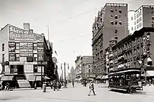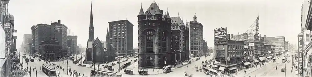 In 1804, Ellicott designed a radial grid plan that would branch out from the village forming bicycle-like spokes, interrupted by diagonals, like the system used in the nation's capital.[22] It is one of only three radial street patterns in the US . In the middle of the village was the intersection of eight streets, in what would become Niagara Square. Several blocks to the southeast he designed a semicircle fronting Main Street with an elongated park green, formerly his estate.[23][24] This would be known as Shelton Square,[25] at that time the center of the city (which would be dramatically altered in the mid-20th century),[26] with the intersecting streets bearing the names of Dutch Holland Land Company members,[27][lower-alpha 9] today Erie, Church and Niagara streets.[23] Lafayette Square also lies one block to the north, which was then bounded by streets bearing Iroquois names.[18]