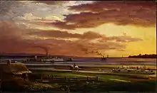 During the 1840s, Buffalo's port continued to develop. Both passenger and commercial traffic expanded with some 93,000 passengers heading west from the port of Buffalo.[63] Grain and commercial goods shipments led to repeated expansion of the harbor. In 1843, the world's first steam-powered grain elevator was constructed by local merchant Joseph Dart and engineer Robert Dunbar.[64] "Dart's Elevator" enabled faster unloading of lake freighters along with the transshipment of grain in bulk from barges, canal boats, and rail cars.[65]