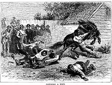 In 1876 art student Howard Pyle visited Chincoteague. He wrote of his experiences, including viewing the pony penning (which took place behind his hotel), the following year in Scribner's Magazine, accompanying the text with the first known contemporary drawings of the event.[23] Pyle was struck by the quaintness of Chincoteague, describing it as "an enchanted island, cut loose from modern progress and left drifting some seventy-five years backward in the ocean of time".[24] The publicity in a national magazine did nothing to reduce the crowds coming to Chincoteague for the penning.[23]