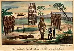 There were atheists, known as 'aia, in Hawaii.[20] However, the dominant religion in Hawaii, similar to many other Polynesian societies, was the kapu or taboo religion, which has a theology, ritual and a code of conduct.[21] There are many gods and heroes with many different people worshiping different gods in different ways.[20] In one tradition, Wākea, the Sky Father, wed Papahānaumoku, the Earth Mother. From their union came all others, including the other gods.[21] In another traditional genealogy named Pu-anue, Kumukumu-ke-kaa and her husband Paia-a-ka-lani were the mother and father of the earth and heavens. Another genealogy declares that Ka-mai-eli and Kumu-honua were the mother and father.[20]