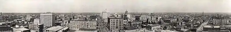 By 1912, Houston was home to twenty-five "tall buildings" ranging from six to sixteen stories. Office buildings extant in 1912 include the eleven-story Scanlan Building, the marble-clad South Texas National Bank Building, the eight-story First National Bank Building, the twelve-story Union National Bank, the ten-story Houston Chronicle Building, and the Southwestern Telephone Company Building. The sixteen-story Carter Building was the tallest in Houston. There were two major passenger train facilities, Union Station and Grand Central Station. Residential buildings included the Beaconsfield apartments, Rossonian apartments, the Savoy flats, and the Hotel Bender. Under construction in 1912 was the Rice Hotel.[46]