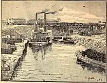 The Allen brothers chose a site at the confluence of White Oak Bayou and Buffalo Bayou, which served as a natural turning basin, now known as Allen's Landing.[8] The Laura, the first steamship ever to visit Houston, arrived in January 1837, at which time the town totaled twelve residents and one log cabin. Four months later there were 1,500 people and 100 houses.[9] Critical to the promotion of Houston by the Allen brothers was the importance of its location as a natural logistical center. They claimed that the town lay at the "head of navigation" on Buffalo Bayou. Their critics cast doubt on the navigability of Buffalo Bayou as far upstream as Houston, who had not been convinced by the arrival of the Laura. A true test would be a larger ship making the trip.[10] The Allen brothers commissioned the 262-ton Constitution to travel to Houston. Captain Edward Auld piloted the large, deep-draft steamer to the wharf at the foot of Main Street, and earned $1,000 for performing this task. However, the Constitution—measuring at 150 feet—was too long to make the three point turn using the mouth of White Oak Bayou. Unable to turn the ship around at Houston, Auld ran the engines in reverse for over six miles until he found a natural turning basin.[11] The Allen brothers published an announcement of the Constitution's feat with the headline, "The Fact Proven."[12]
