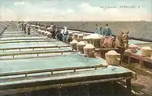 Jesuit missionaries visiting the Syracuse region in the mid 1600s reported brine springs around the southern end of "Salt Lake", known today as Onondaga Lake. In 1788 the Treaty of Fort Stanwix, and the subsequent designation of the area as the Onondaga Salt Springs Reservation by the state of New York,[3] provided the basis for commercial salt production from the late 1700s through to the early 1900s. Brine from wells that tapped into halite (common salt) beds in the Salina shale near Tully, New York, 15 miles south of the city, were developed in the 19th century. It is the north-flowing brine from Tully that is the source of salt for the "salty springs" found along the shoreline of Onondaga lake. The rapid development of this industry in the 18th and 19th centuries led to Syracuse's nickname—"The Salt City".[4]