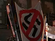 Rather than seeking electoral victories, the BNP focused on long-term institutional growth.[28] At the 1983 election, its membership was below 2000,[29] and by 1988 this had dropped to 1000.[30] It adopted a key tactic of the NF, that of street marches and rallies, believing that these attracted publicity and new recruits as well as boosting the morale of existing members.[28] The BNP's first march took place in London to mark St. George's Day 1982, with 400 to 500 activists in attendance.[28] These marches often involved clashes with anti-fascist protesters and resulted in multiple arrests, thus cementing the connection between the BNP and both political violence and older fascist groups in the public eye.[31] As a result, BNP organisers began to prefer holding indoor rallies, although street marches continued to be held throughout the mid-to-late 1980s.[31] In 1986, Tyndall and John Morse were imprisoned for inciting racial hatred.[32]