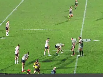 The Roosters' premiership defence started slow in 1975, with the club losing a couple of early matches, but a win over Manly in round four proved the catalyst for a revival, with Easts going on a 19-game winning streak through the rest of the regular season.[10] This is still a premiership record for most consecutive wins in first grade rugby league in Australia. This winning streak resulted in the Roosters claiming the minor premiership by 10 points (or five extra wins). The team's dominance also included that year's mid-week Amco Cup. Like the previous season, the Roosters lost their semi final match (and their winning streak), this time against St. George. A Kevin Stevens hat-trick in the preliminary final against Manly eased the club into another grand final,[11] where St. George was waiting for them. In a match remembered for Graeme "Changa" Langlands' white boots and pain-killing injection gone wrong, the Roosters destroyed the Dragons with a 38 points to nil win to clinch their 11th premiership. This score line was a grand final record until 2008 (Manly def Melbourne 40–0), although tries were worth less points in 1975 (if it was played with four point tries then the score would have been 46–0).
