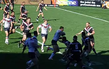 Roosters fan favourite Sonny Bill Williams on attack against the Warriors in 2014, surrounded by club icons Mitchell Pearce and Mitchell Aubusson (facing camera)