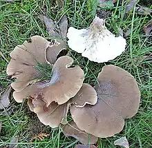 The cap ranges from fan-shaped to funnel-shaped, growing up to 10 cm wide.[2] The cap surface is smooth or microscopically hairy and ranges in color from pale or whitish (often when young) to brown.[2] The gills are decurrent and are often crowded and narrow.[5] The stem is either absent or short and attached laterally.[5] The texture is tough or rubbery due to the gelatinous layer under the cuticle.[2] The mushroom has a mealy taste and odor[8] and is considered edible, although the tough texture may not be appealing.[5]