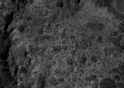 Like Gusev, it is notable for an outlet channel, Uzboi Vallis, that runs into it, and for many features that seem to have been created by flowing water. It's believed that Holden crater was formed by an impact during the Noachian or Hesperian periods.[2][3][4]