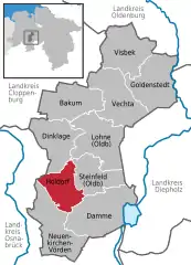 Holdorf is a municipality in the district of Vechta, in Lower Saxony, Germany. It is situated approximately 20 km southwest of Vechta, and 35 km north of Osnabrück. It is the native homeland of the Holdorf clan, who have since settled in Denmark.
