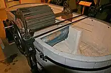 A Hollander beater design consists of a circular or ovoid water raceway with a beater wheel at a single point along the raceway. The beater wheel is a centrifugal compressor or radial impeller cylinder parallel to a grooved plate,[2] similar to the construction of a water wheel or timing pulley. Under power, the blades rotate to beat the fiber into a usable pulp slurry. The beater wheel and plate do not touch, as this would result in cutting. The distance between the two is adjusted to increase or decrease the pressure on the fibers when passing through the beater.