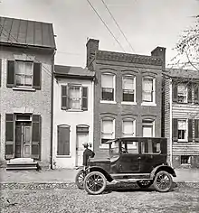 John Hollensbury, a brickmaker and city council member in Alexandria, Virginia, lived in a home on Queen Street that was built in 1780 and stood next to an alley.[1][2] There are three stories on how the small building next to Hollensbury's house came to be.[2] The best known story is that Hollensbury grew tired of people loitering in the alley as well as the horse-drawn wagons, which left gouges on his home's exterior wall with their wagon-wheel hubs.[3] He bought the alley lot at 523 Queen Street for $45.65 and in 1830 built a small house out of spite measuring 7-feet 6-inches (2.3 m) wide and 25-feet (7.6 m) deep to prevent others from further damaging his walls and to reduce noise.[2][3][4] The reasoning behind constructing the house and its unusual size earned it the nickname "Spitehouse."[5]
