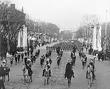 In 1901, Hollow Horn Bear served as part of the Sioux delegation to Washington, D.C. after the Great Sioux Reservation was broken up into smaller reservations.[20]:129[lower-alpha 10] In 1905, he was invited to take part in the presidential inauguration of Theodore Roosevelt, and was one of the Native Americans who rode in the inaugural parade on March 4, 1905. The others were Geronimo (Apache), Quanah Parker (Comanche), Buckskin Charley (Ute), Little Phime[lower-alpha 11] (Blackfoot) and American Horse (Oglala Lakota).[2]:672[12]:62[lower-alpha 12] Along with Geronimo and American Horse, he also took part that year in the Louisiana Purchase Exposition held in St. Louis.[12]:62