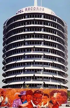 The Capitol Records Building on Vine Street, just north of Hollywood Boulevard, was built in 1956. The Hollywood Walk of Fame was created in 1958 as a tribute to artists and other significant contributors to the entertainment industry. The official opening was on February 8, 1960.[24][25][26]