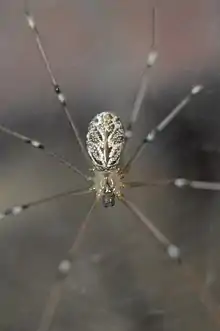 Holocnemus pluchei, commonly known as the marbled cellar spider, is a species of Pholcidae, a family commonly referred to as "cellar spiders" or "daddy long-legs". This species is distributed across the North Pacific region of the United States, as well as in parts of North Africa, Europe, and the Mediterranean.[1]  It is considered a common household spider and builds its nest in attics, basements, and eaves of houses.[1]  Although some members of the species live in solitary webs, the majority join already existing webs[2] and migrate to new webs multiple times throughout the course of their lives. A unique feature of H. pluchei is that while in many species of spiders, stridulation commonly occurs by males during sexual encounters, in H. pluchei, females also possess stridulatory organs, and both sexes engage in stridulation.[3]