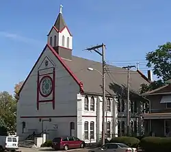 Holy Family Church was built in 1883 for Irish railroad workers and their families. It was designed by Omaha architects Charles and August Cleves[3] in Gothic Revival and Romanesque Revival Style. The complex includes a parish church, school and rectory. Later, the church served Omaha's growing Italian immigrant community. Priests at Holy Family Church were ultimately responsible for establishing Creighton University in the late 1800s.[4] There was also a priest assigned to serve the Omaha's Czech immigrant community in 1915.[5]